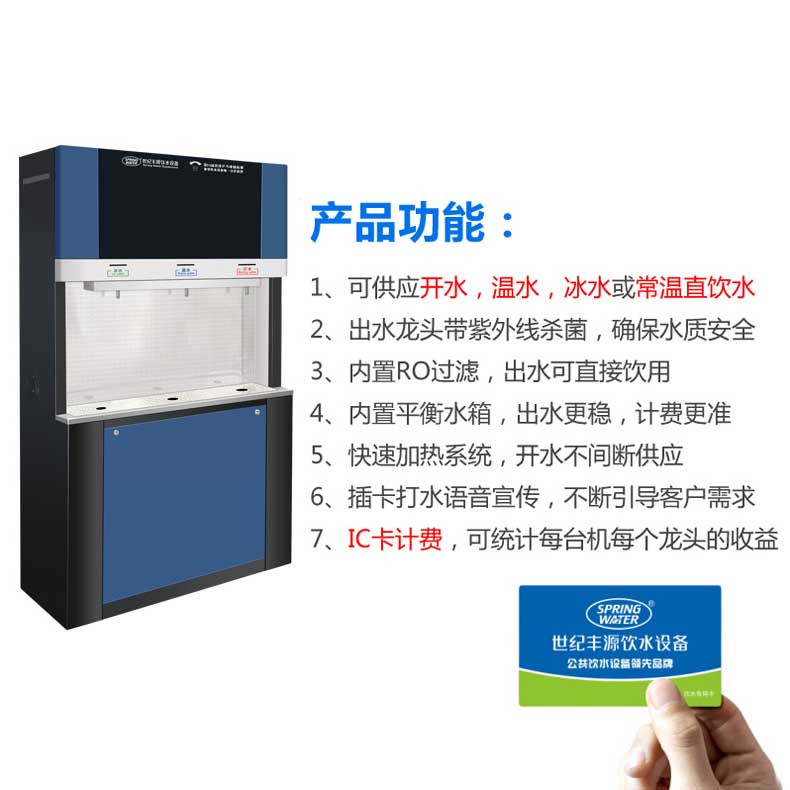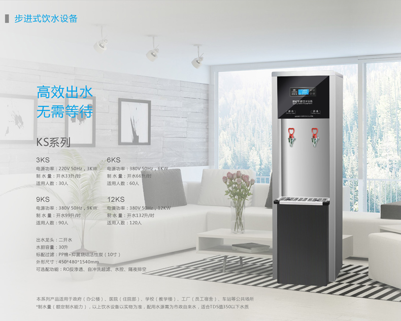 终端:每间办公室可采用温热型饮水机,既有温水又有开水,部分地区有特别需要的还可选用带制冰水功能的冰热型终端机。